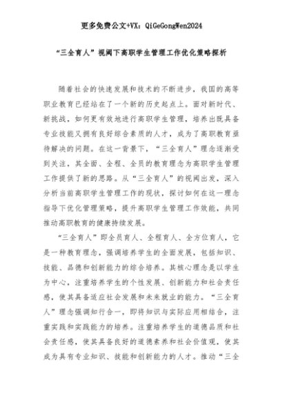 【七哥公文】2025年:“三全育人”视阈下高职学生管理工作优化策略探析+更多免费公文+VX:QiGeGongWen2024+更多免费公文+VX:QiGeGongWen2024