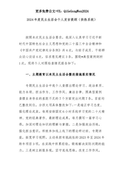 【七哥公文】2025年:2024年度民主生活会个人发言提纲(供热系统)+更多免费公文+VX:QiGeGongWen2024+更多免费公文+VX:QiGeGongWen2024