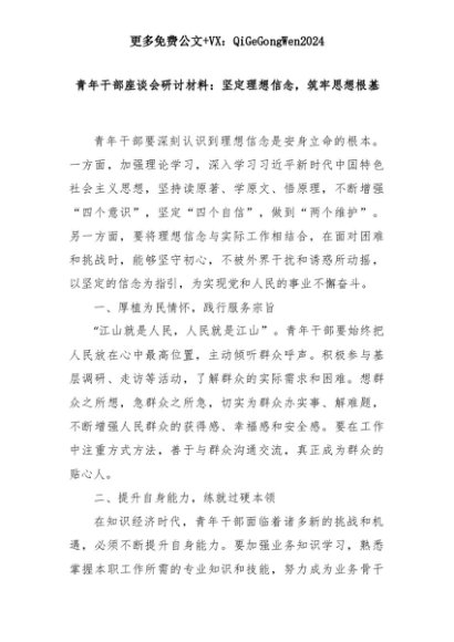 【七哥公文】2025年:青年干部座谈会研讨材料:坚定理想信念,筑牢思想根基+更多免费公文+VX:QiGeGongWen2024+更多免费公文+VX:QiGeGongWen2024