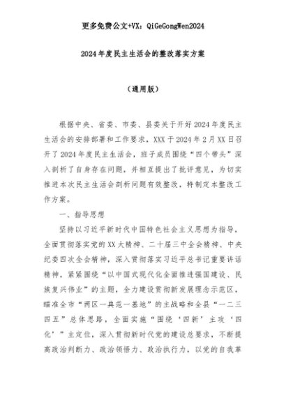 【七哥公文】2025年:2024年度民主生活会的整改落实方案(通用版)+更多免费公文+VX:QiGeGongWen2024+更多免费公文+VX:QiGeGongWen2024