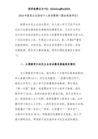 【七哥公文】2025年:2024年度民主生活会个人发言提纲(国企党委书记)+更多免费公文+VX:QiGeGongWen2024+更多免费公文+VX:QiGeGongWen2024