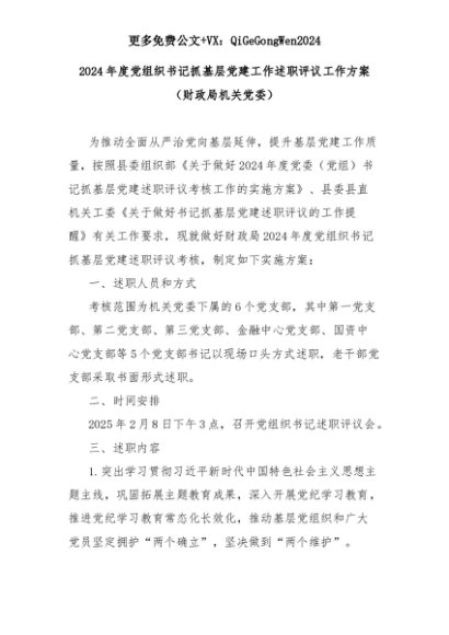 【七哥公文】2025年:2024年度党组织书记抓基层党建工作述职评议工作方案(财政局机关党委)+更多免费公文+VX:QiGeGongWen2024+更多免费公文+VX:QiGeGongWen2024