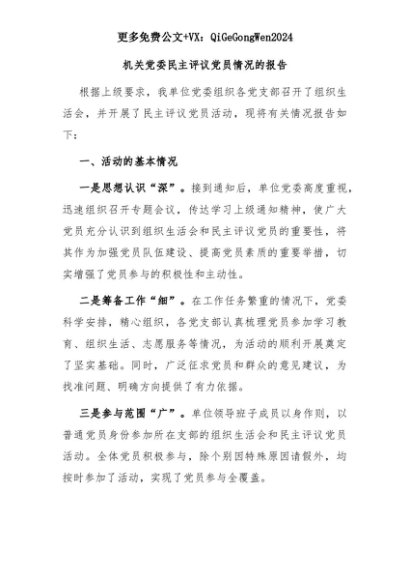 【七哥公文】2025年:机关党委民主评议党员情况的报告+更多免费公文+VX:QiGeGongWen2024+更多免费公文+VX:QiGeGongWen2024