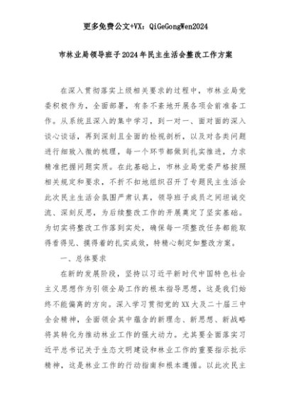 【七哥公文】2025年:市林业局领导班子2024年民主生活会整改工作方案+更多免费公文+VX:QiGeGongWen2024+更多免费公文+VX:QiGeGongWen2024