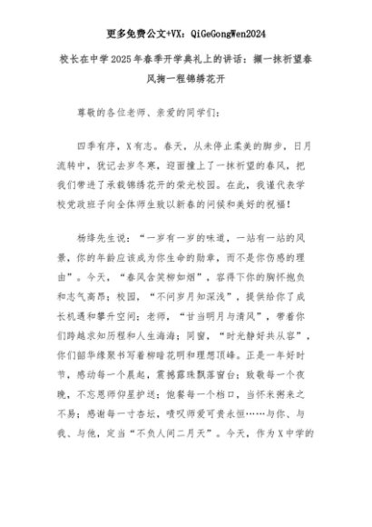 【七哥公文】2025年:校长在中学2025年春季开学典礼上的讲话:撷一抹祈望春风掬一程锦绣花开+更多免费公文+VX:QiGeGongWen2024+更多免费公文+VX:QiGeGongWen2024