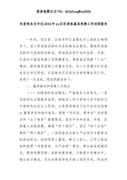 【七哥公文】2025年:纪委党总支书记2024年xx区纪委抓基层党建工作述职报告+更多免费公文+VX:QiGeGongWen2024+更多免费公文+VX:QiGeGongWen2024