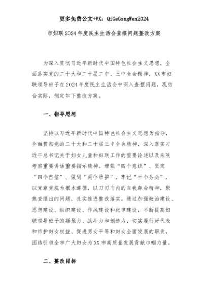 【七哥公文】2025年:市妇联2024年度民主生活会查摆问题整改方案+更多免费公文+VX:QiGeGongWen2024+更多免费公文+VX:QiGeGongWen2024
