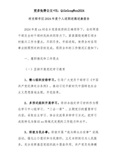 【七哥公文】2025年:村支部书记2024年度个人述职述德述廉报告+更多免费公文+VX:QiGeGongWen2024+更多免费公文+VX:QiGeGongWen2024