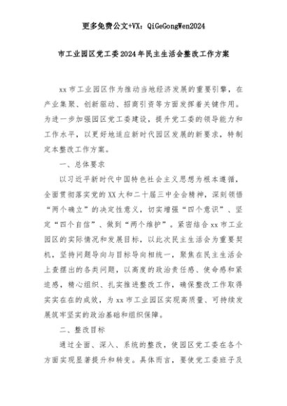 【七哥公文】2025年:市工业园区党工委2024年民主生活会整改工作方案+更多免费公文+VX:QiGeGongWen2024+更多免费公文+VX:QiGeGongWen2024