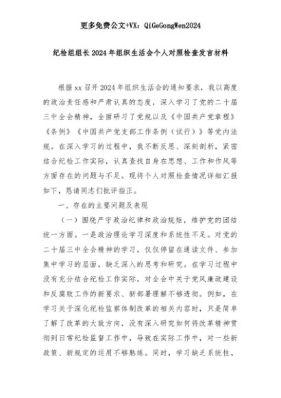 【七哥公文】2025年:纪检组组长2024年组织生活会个人对照检查发言材料+更多免费公文+VX:QiGeGongWen2024+更多免费公文+VX:QiGeGongWen2024