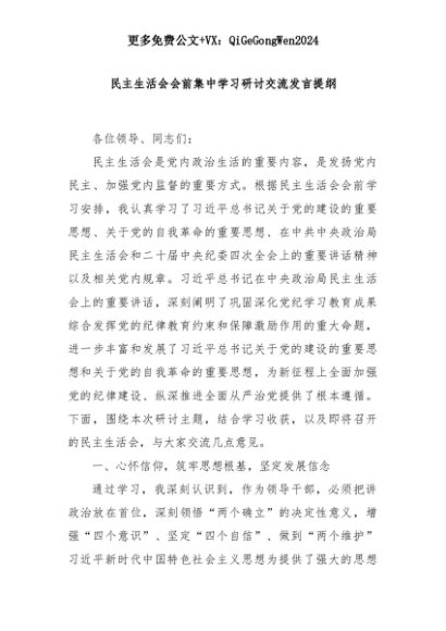 【七哥公文】2025年:民主生活会会前集中学习研讨交流发言提纲+更多免费公文+VX:QiGeGongWen2024+更多免费公文+VX:QiGeGongWen2024