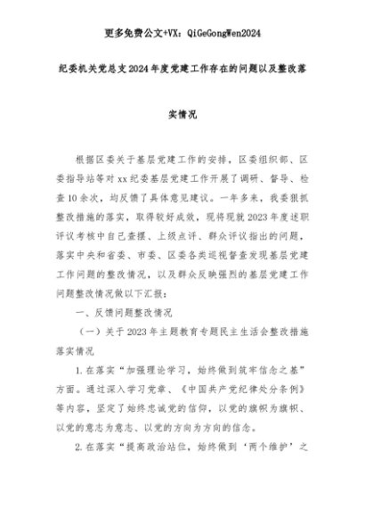【七哥公文】2025年:纪委机关党总支2024年度党建工作存在的问题以及整改落实情况+更多免费公文+VX:QiGeGongWen2024+更多免费公文+VX:QiGeGongWen2024