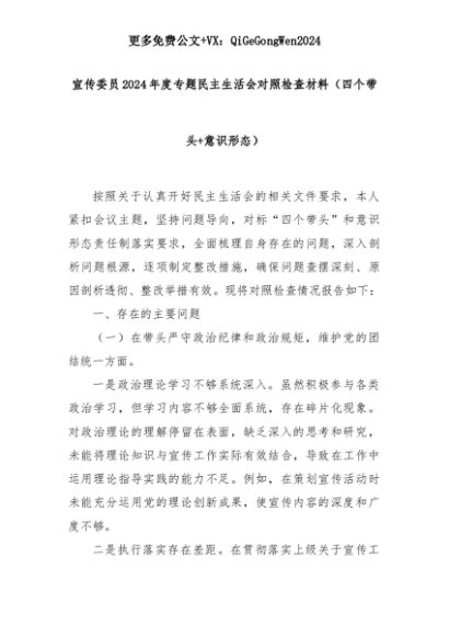 【七哥公文】2025年:宣传委员2024年度专题民主生活会对照检查材料(四个带头+意识形态)+更多免费公文+VX:QiGeGongWen2024+更多免费公文+VX:QiGeGongWen2024