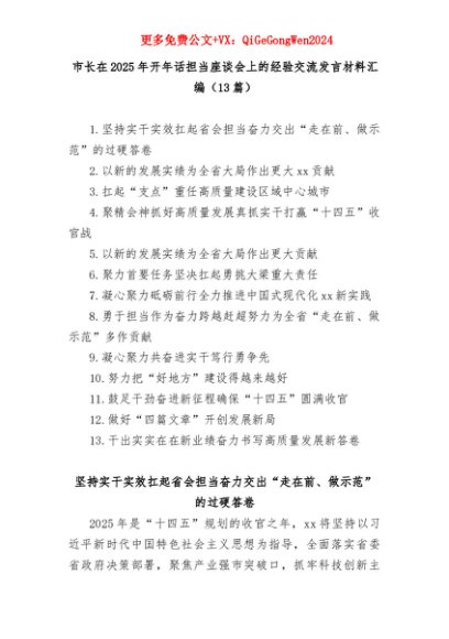 【七哥公文】2025年:(13篇)市长在2025年开年话担当座谈会上的经验交流发言材料汇编+更多免费公文+VX:QiGeGongWen2024+更多免费公文+VX:QiGeGongWen2024