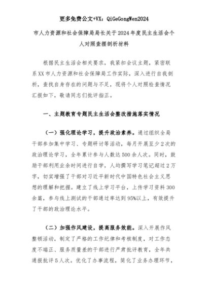 【七哥公文】2025年:市人力资源和社会保障局局长关于2024年度民主生活会个人对照查摆剖析材料+更多免费公文+VX:QiGeGongWen2024+更多免费公文+VX:QiGeGongWen2024