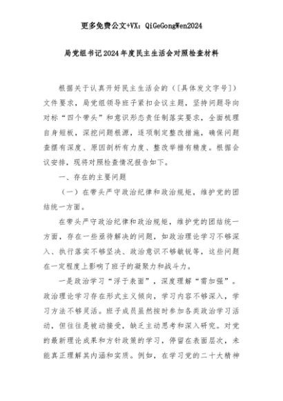 【七哥公文】2025年:局党组书记2024年度民主生活会对照检查材料+更多免费公文+VX:QiGeGongWen2024+更多免费公文+VX:QiGeGongWen2024