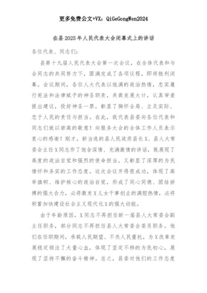 【七哥公文】2025年:在县2025年人民代表大会闭幕式上的讲话+更多免费公文+VX:QiGeGongWen2024+更多免费公文+VX:QiGeGongWen2024