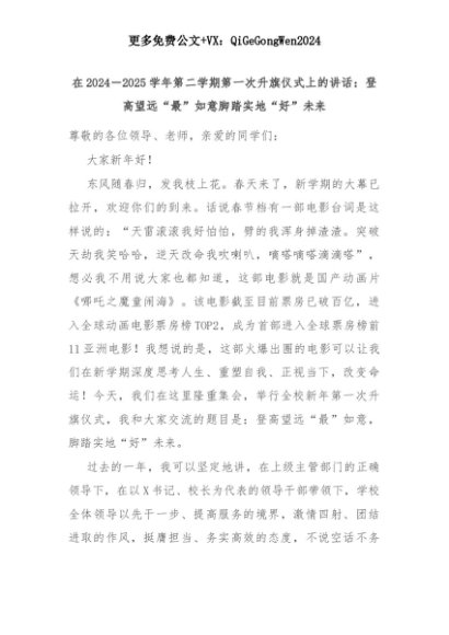 【七哥公文】2025年:在2024-2025学年第二学期第一次升旗仪式上的讲话:登高望远“最”如意脚踏实地“好”未来+更多免费公文+VX:QiGeGongWen2024+更多免费公文+VX:QiGeGongWen2024