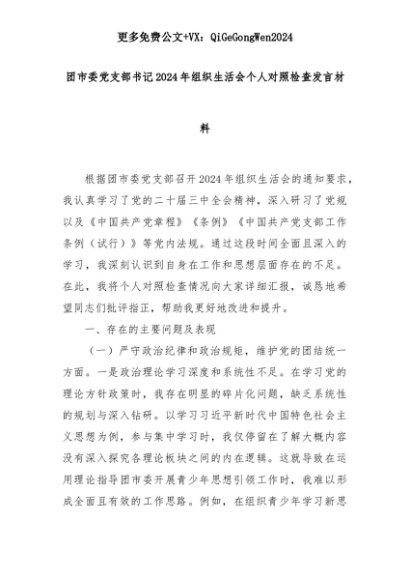 【七哥公文】2025年:团市委党支部书记2024年组织生活会个人对照检查发言材料+更多免费公文+VX:QiGeGongWen2024+更多免费公文+VX:QiGeGongWen2024