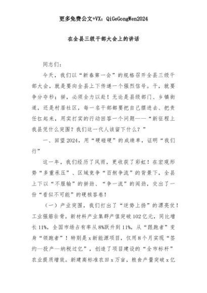 【七哥公文】2025年:在全县三级干部大会上的讲话+更多免费公文+VX:QiGeGongWen2024+更多免费公文+VX:QiGeGongWen2024