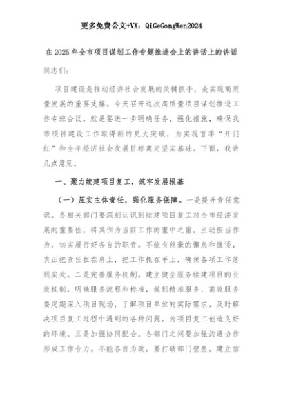 【七哥公文】2025年:在2025年全市项目谋划工作专题推进会上的讲话上的讲话+更多免费公文+VX:QiGeGongWen2024+更多免费公文+VX:QiGeGongWen2024