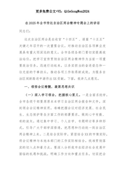 【七哥公文】2025年:在2025年全市传达自治区两会精神专题会上的讲话+更多免费公文+VX:QiGeGongWen2024+更多免费公文+VX:QiGeGongWen2024
