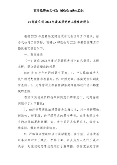 【七哥公文】2025年:xx邮政公司2024年度基层党建工作整改报告+更多免费公文+VX:QiGeGongWen2024+更多免费公文+VX:QiGeGongWen2024