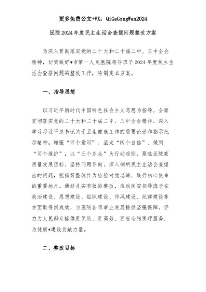【七哥公文】2025年:医院2024年度民主生活会查摆问题整改方案+更多免费公文+VX:QiGeGongWen2024+更多免费公文+VX:QiGeGongWen2024