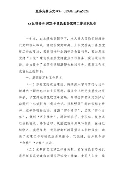 【七哥公文】2025年:xx区税务局2024年度抓基层党建工作述职报告+更多免费公文+VX:QiGeGongWen2024+更多免费公文+VX:QiGeGongWen2024