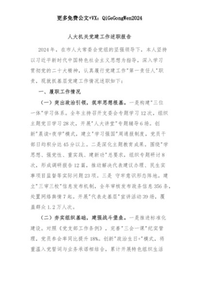 【七哥公文】2025年:人大机关党建工作述职报告+更多免费公文+VX:QiGeGongWen2024+更多免费公文+VX:QiGeGongWen2024