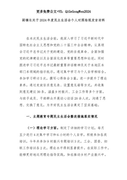 【七哥公文】2025年:副镇长关于2024年度民主生活会个人对照检视发言材料+更多免费公文+VX:QiGeGongWen2024+更多免费公文+VX:QiGeGongWen2024
