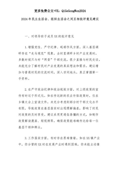 【七哥公文】2025年:2024年民主生活会、组织生活会之间互相批评意见建议+更多免费公文+VX:QiGeGongWen2024+更多免费公文+VX:QiGeGongWen2024