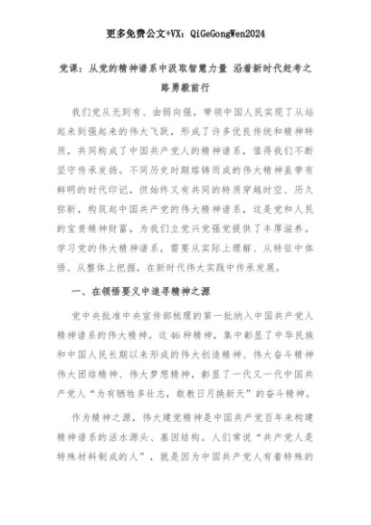 【七哥公文】2025年:党课:从党的精神谱系中汲取智慧力量 沿着新时代赶考之路勇毅前行+更多免费公文+VX:QiGeGongWen2024+更多免费公文+VX:QiGeGongWen2024