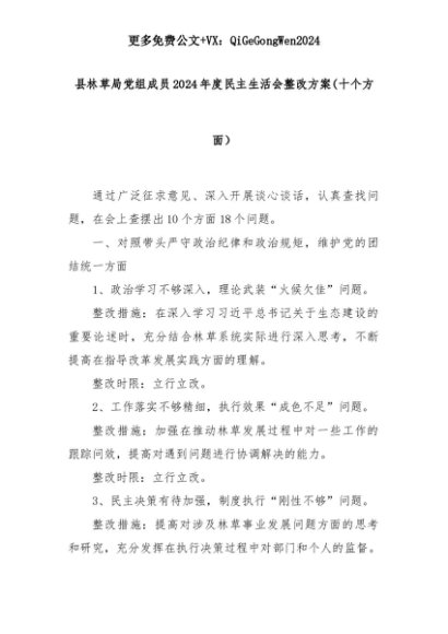 【七哥公文】2025年:县林草局党组成员2024年度民主生活会整改方案(十个方面)+更多免费公文+VX:QiGeGongWen2024+更多免费公文+VX:QiGeGongWen2024