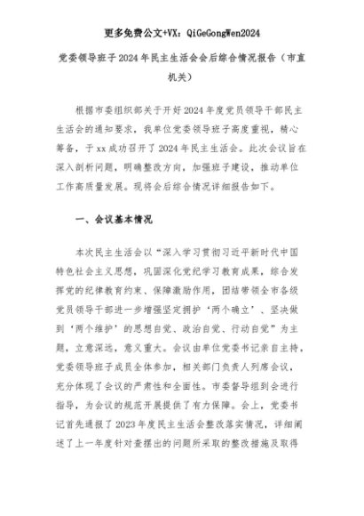 【七哥公文】2025年:党委领导班子2024年民主生活会会后综合情况报告(市直机关)+更多免费公文+VX:QiGeGongWen2024+更多免费公文+VX:QiGeGongWen2024