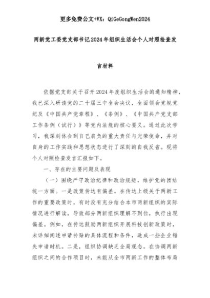 【七哥公文】2025年:两新党工委党支部书记2024年组织生活会个人对照检查发言材料+更多免费公文+VX:QiGeGongWen2024+更多免费公文+VX:QiGeGongWen2024