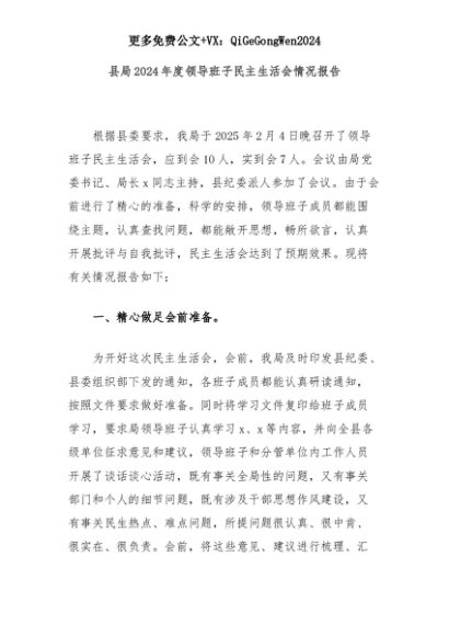 【七哥公文】2025年:县局2024年度领导班子民主生活会情况报告+更多免费公文+VX:QiGeGongWen2024+更多免费公文+VX:QiGeGongWen2024