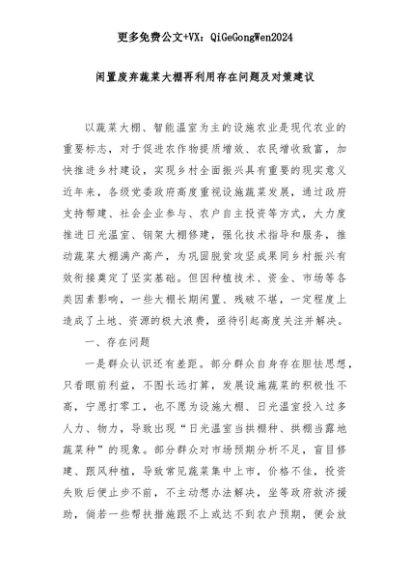 【七哥公文】2025年:闲置废弃蔬菜大棚再利用存在问题及对策建议+更多免费公文+VX:QiGeGongWen2024+更多免费公文+VX:QiGeGongWen2024