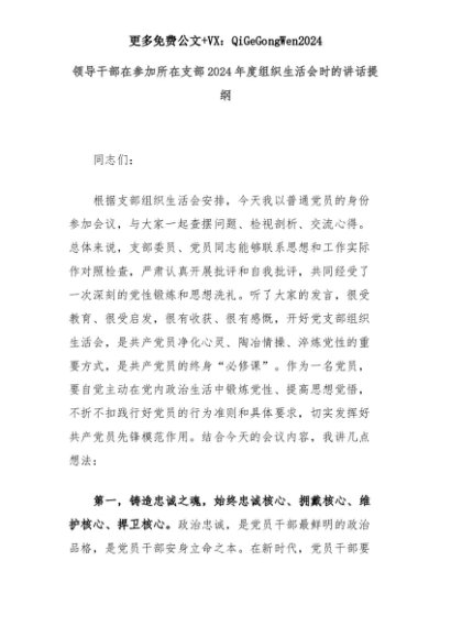 【七哥公文】2025年:领导干部在参加所在支部2024年度组织生活会时的讲话提纲+更多免费公文+VX:QiGeGongWen2024+更多免费公文+VX:QiGeGongWen2024