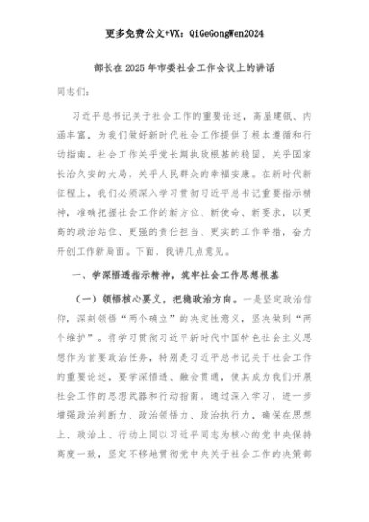 【七哥公文】2025年:部长在2025年市委社会工作会议上的讲话+更多免费公文+VX:QiGeGongWen2024+更多免费公文+VX:QiGeGongWen2024