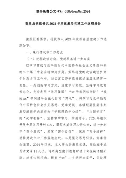 【七哥公文】2025年:财政局党组书记2024年度抓基层党建工作述职报告+更多免费公文+VX:QiGeGongWen2024+更多免费公文+VX:QiGeGongWen2024