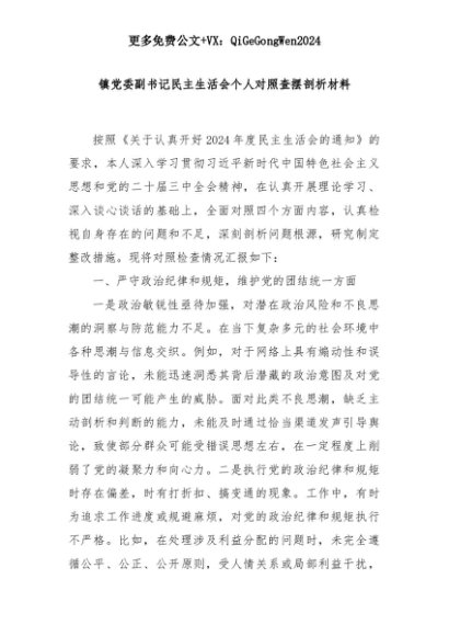 【七哥公文】2025年:镇党委副书记民主生活会个人对照查摆剖析材料+更多免费公文+VX:QiGeGongWen2024+更多免费公文+VX:QiGeGongWen2024
