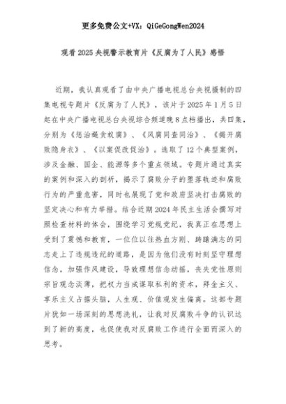 【七哥公文】2025年:观看2025央视警示教育片《反腐为了人民》感悟+更多免费公文+VX:QiGeGongWen2024+更多免费公文+VX:QiGeGongWen2024