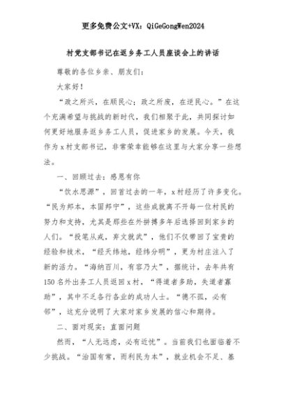 【七哥公文】2025年:村党支部书记在返乡务工人员座谈会上的讲话+更多免费公文+VX:QiGeGongWen2024+更多免费公文+VX:QiGeGongWen2024