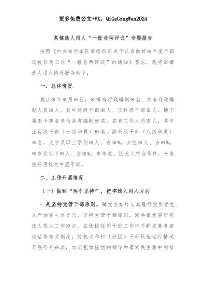 【七哥公文】2025年:某镇选人用人“一报告两评议”专题报告+更多免费公文+VX:QiGeGongWen2024+更多免费公文+VX:QiGeGongWen2024