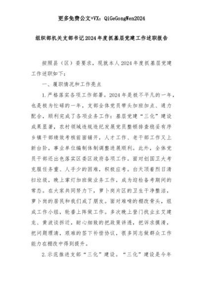 【七哥公文】2025年:组织部机关支部书记2024年度抓基层党建工作述职报告+更多免费公文+VX:QiGeGongWen2024+更多免费公文+VX:QiGeGongWen2024