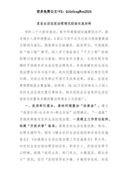 【七哥公文】2025年:某县生活垃圾治理情况经验交流材料+更多免费公文+VX:QiGeGongWen2024+更多免费公文+VX:QiGeGongWen2024