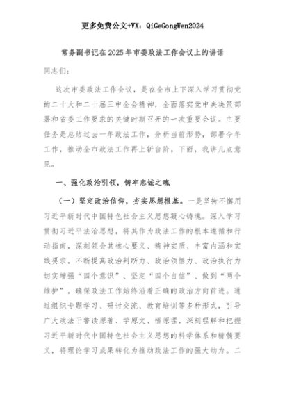 【七哥公文】2025年:常务副书记在2025年市委政法工作会议上的讲话+更多免费公文+VX:QiGeGongWen2024+更多免费公文+VX:QiGeGongWen2024