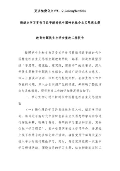 【七哥公文】2025年:街道办学习贯彻总书记新时代中国特色社会主义思想主题教育专题民主生活会整改工作报告+更多免费公文+VX:QiGeGongWen2024+更多免费公文+VX:QiGeGongWen2024