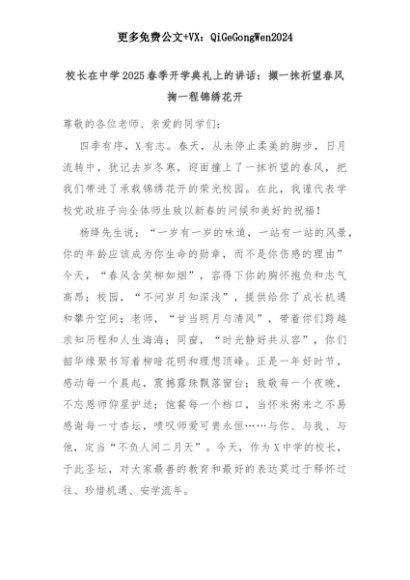【七哥公文】2025年:校长在中学2025春季开学典礼上的讲话:撷一抹祈望春风掬一程锦绣花开+更多免费公文+VX:QiGeGongWen2024+更多免费公文+VX:QiGeGongWen2024